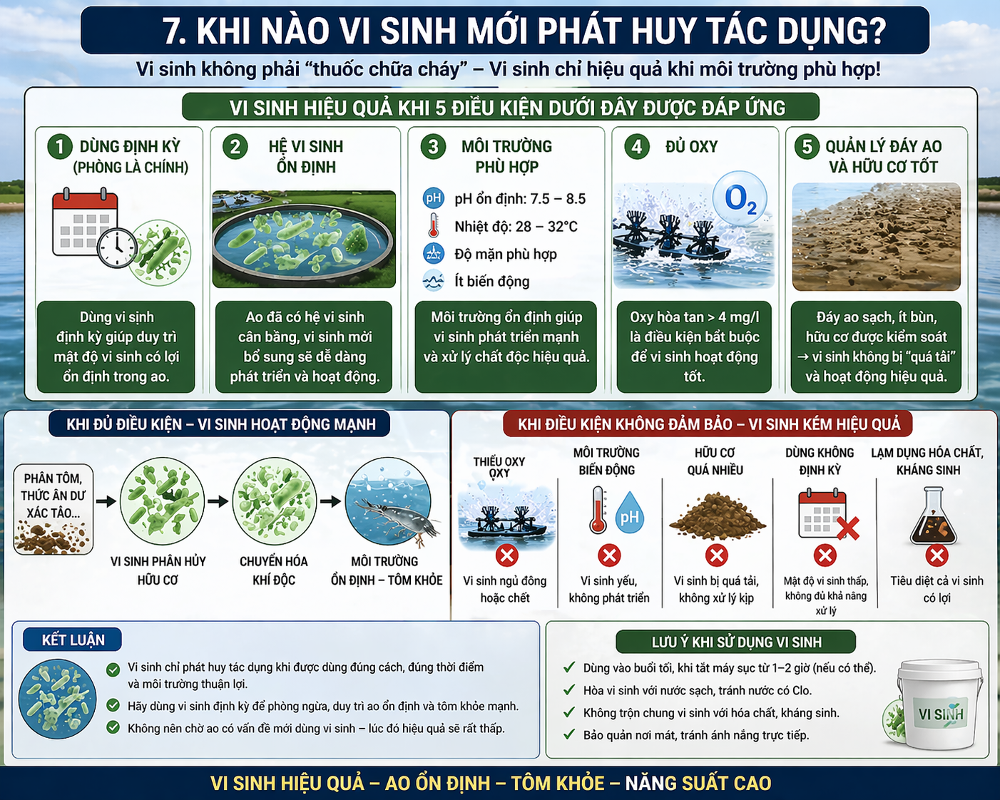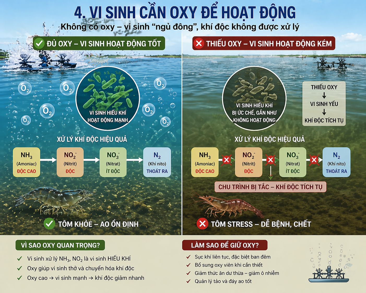 - Nếu ao thiếu oxy → vi sinh gần như “tê liệt”
