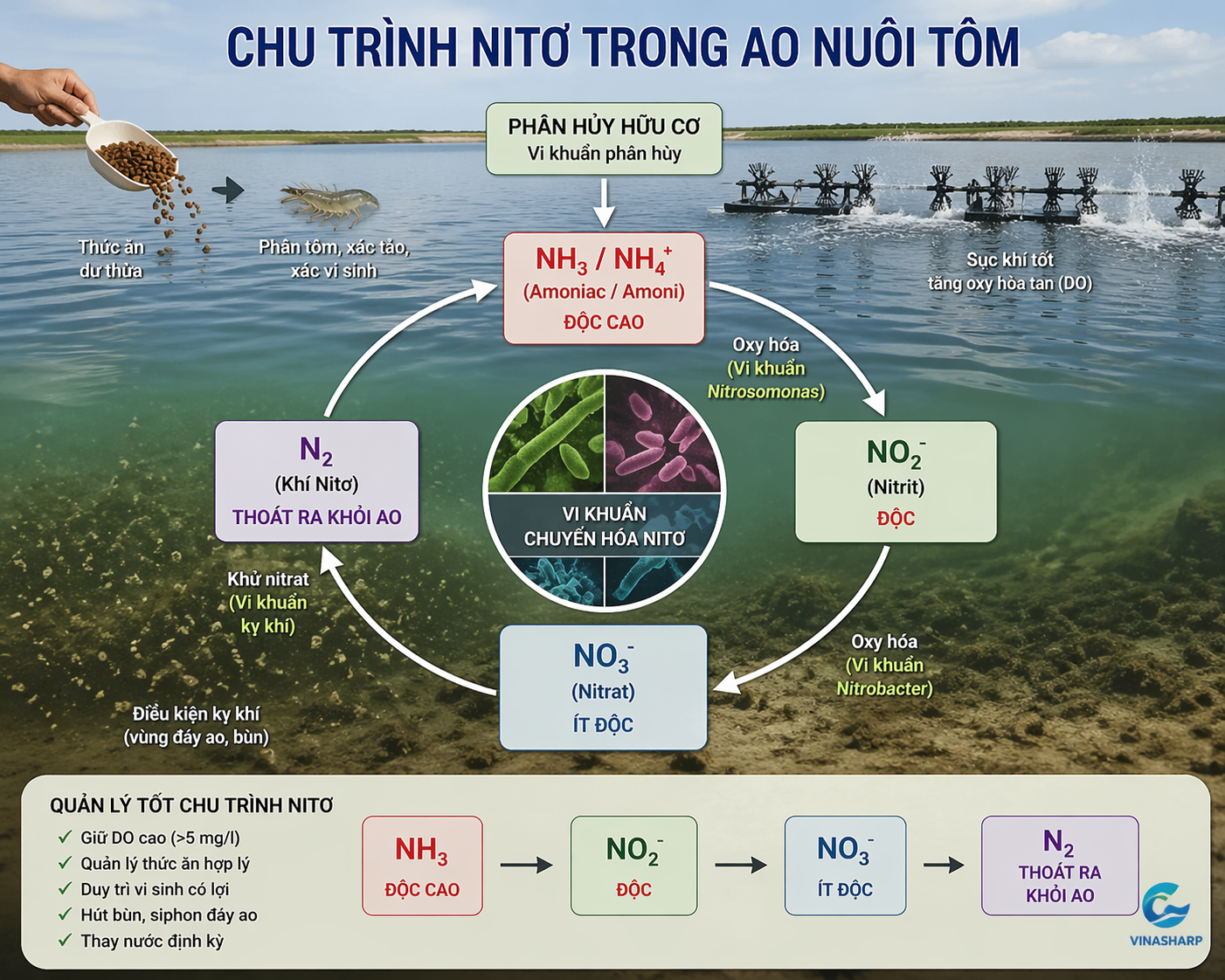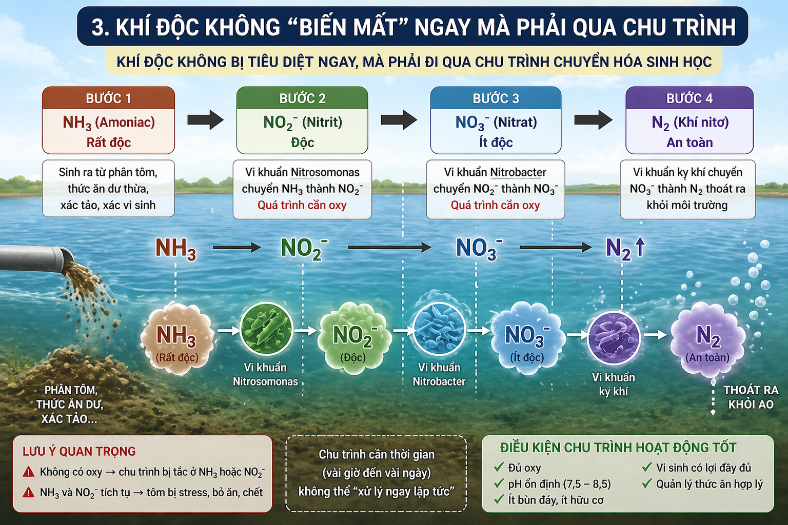 Trong nuôi tôm, rất nhiều người tin rằng chỉ cần đánh vi sinh là xử lý được ngay khí độc như NH3, NO2 hay H2S. Nhưng thực tế, vi sinh KHÔNG thể “ăn” khí độc ngay lập tức. Hiểu sai điểm này là nguyên nhân khiến nhiều ao tôm xử lý mãi không hiệu quả, thậm chí còn tệ hơn.