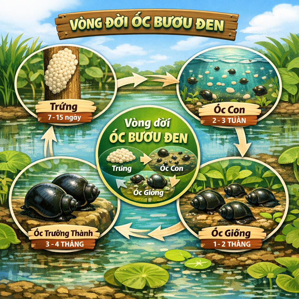 Vòng đời ốc bươu đen gồm 4 giai đoạn chính: trứng → ốc con → ốc giống → ốc trưởng thành.